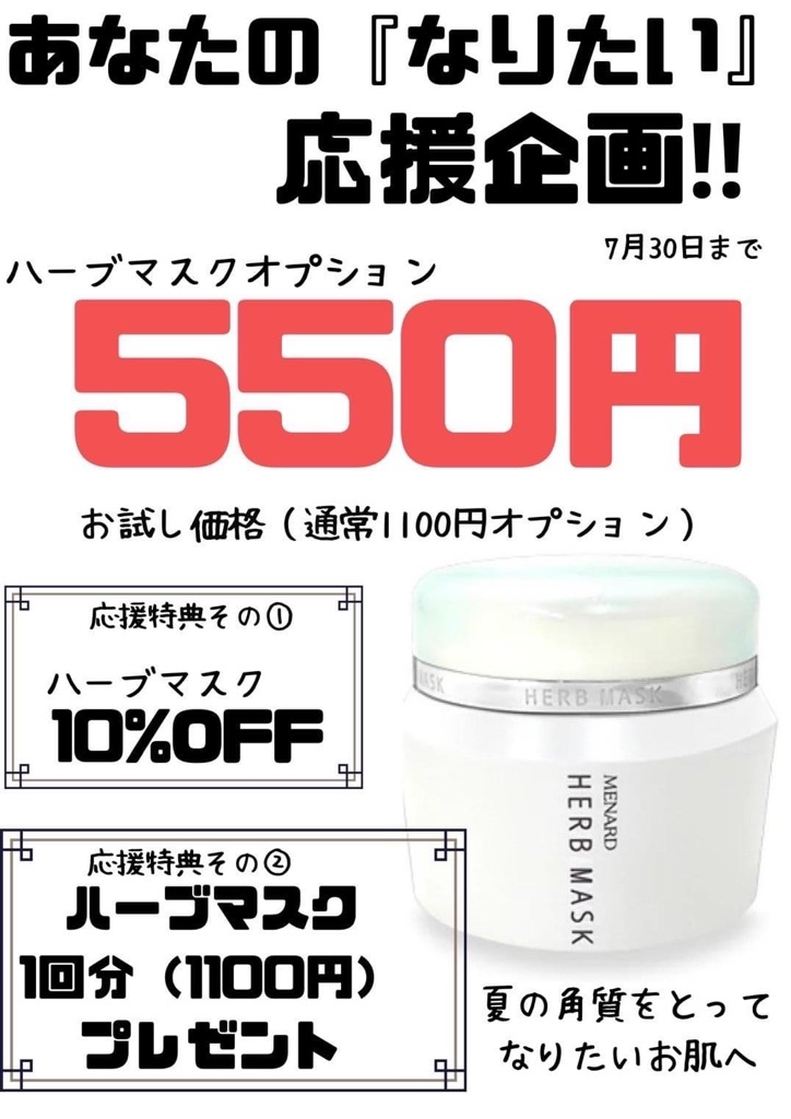 既存のお客様には あなたの『なりたい』応援企画(ハーブマスクオプションパック)をしております。
